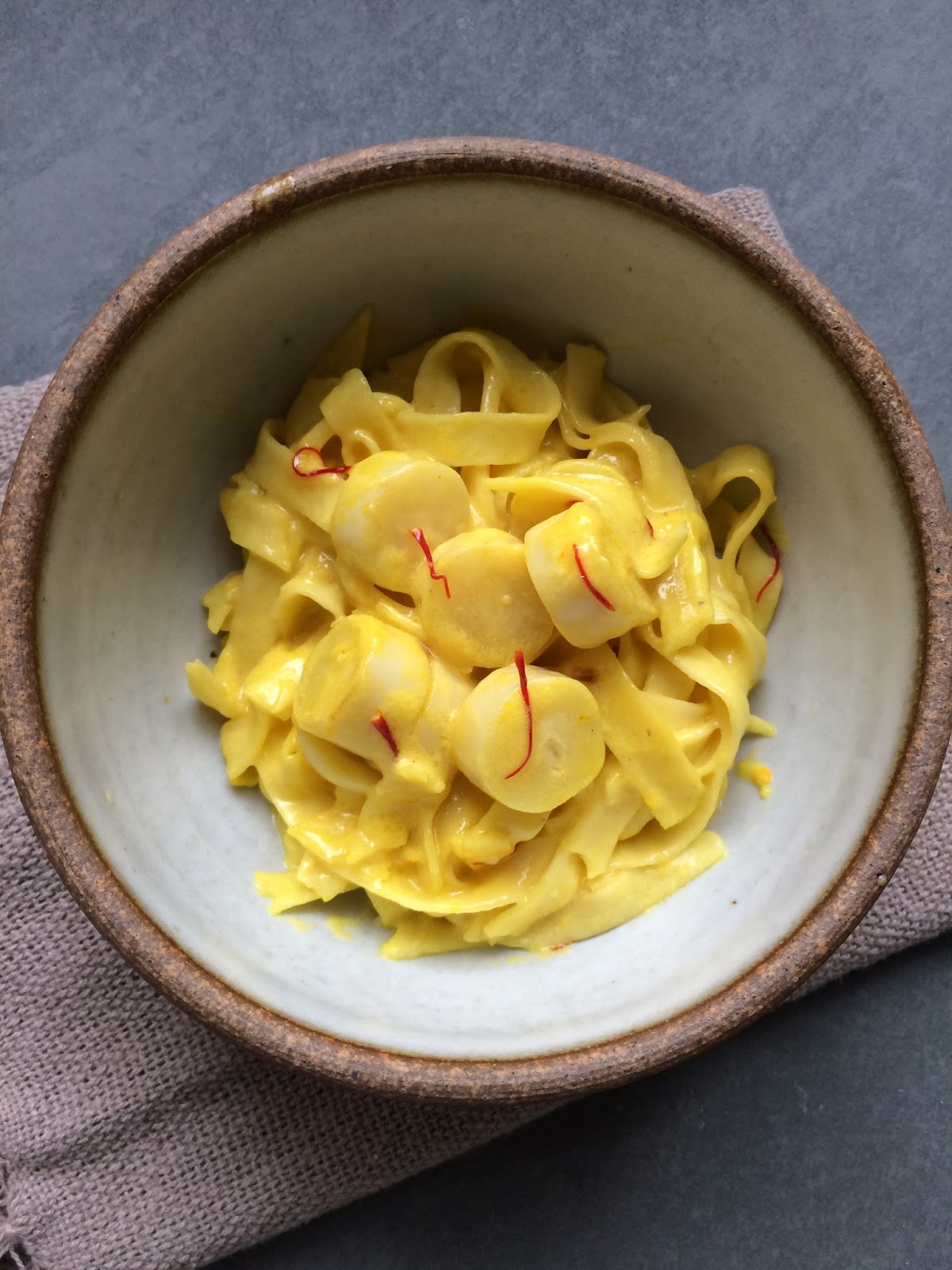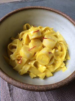 O açafrão verdadeiro é  extraído dos pistilos de flores de Crocus Sativus, uma planta da família das Iridáceas. É utilizado desde a antiguidade como especiaria, principalmente na culinária do Mediterrâneo. O açafrão verdadeiro é tido como uma das mais caras ou a mais cara especiaria do mundo uma vez que, para se obter um quilo de açafrão seco, são processadas manualmente cerca de 150.000 flores, e é preciso cultivar uma área de aproximadamente 2000  m².  Quando voce vai em um restaurante barato, ou de preço mediano e encontra um prato que diz que é feito de açafrão, desconfie. Provavelmente é feito de açafrão da terra, que provem de uma raiz e é totalmente diferente do açafrão verdadeiro. Na foto abaixo deixei os pistilos do açafrão verdadeiro na receita para que voces pudessem ver a diferença.